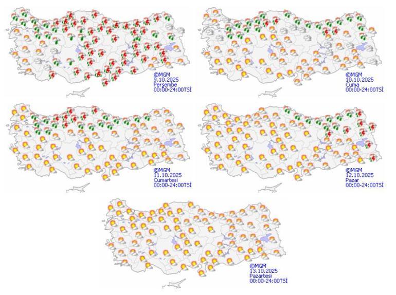 Meteoroloji Genel Müdürlüğü tarafından yapılan tahminlere göre: Ülkemiz genelinin parçalı ve çok bulutlu, Marmara’nın kuzey ve doğusu, Akdeniz, İç Anadolu, Karadeniz, Doğu Anadolu’nun kuzey ve batısı, Güneydoğu Anadolu’nun batısı ile Çanakkale, Kütahya, Bitlis ve Van çevrelerinin sağanak ve yer yer gök gürültülü sağanak yağışlı geçeceği tahmin ediliyor. Yağışların, Doğu Akdeniz’in iç kesimleri, Doğu Karadeniz kıyıları, Zonguldak, Bartın, Ordu ve Erzincan çevreleri ile Kayseri ve Sivas’ın doğu ilçelerinde yerel kuvvetli olması bekleniyor.