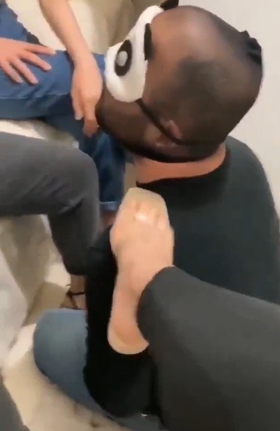 Kaydedilen videoda kadınlar yüzünü göstermezken, erkeğin ise kafasına külotlu çorap ve gözlerine de uyku bandı taktıkları görüldü.